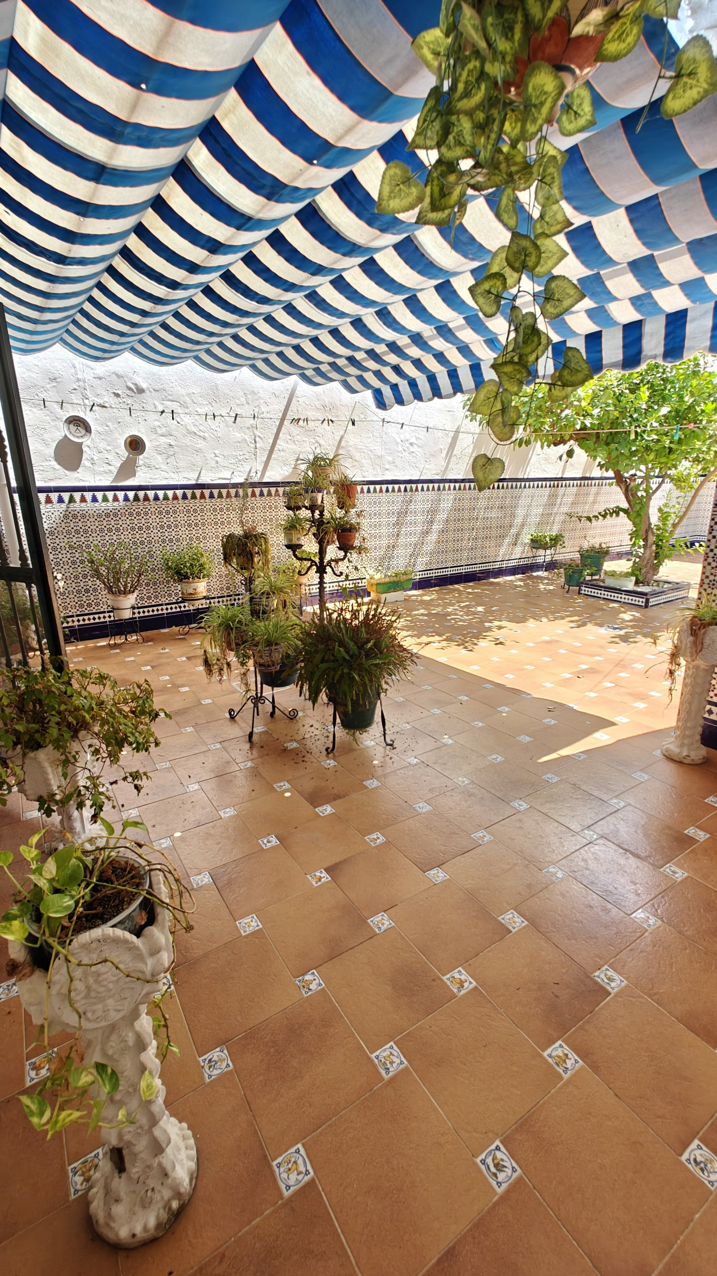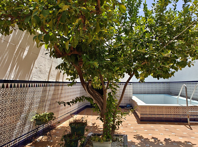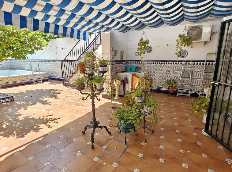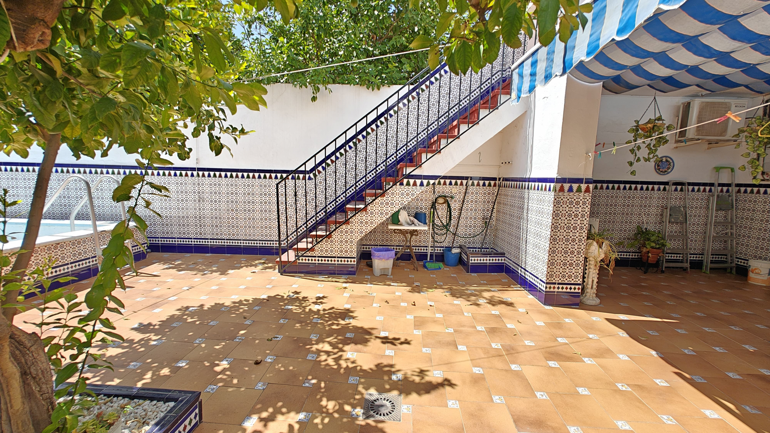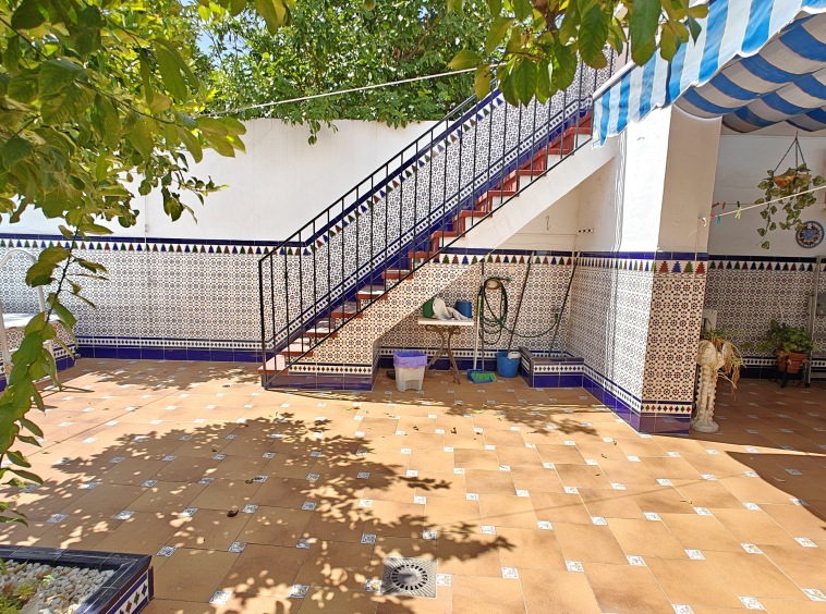 El el patio encontraremos la piscina, un trastero y un gran toldo que nos dará una sombra ideal para pasar los buenos momentos en reunión sin que nadie este expuesto al sol, también tenemos bajo la terraza de primera planta, un espacio destinado a la lavadora que cuenta con un mueble a medida para la lavadora y para la ropa sucia, el termo eléctrico también se encuentra en esa zona. Desde aquí y al igual que desde una de la habitaciones de la segunda planta, podremos acceder a la azote donde tendremos un tragaluz para iluminar el baño de arriba de forma natural.