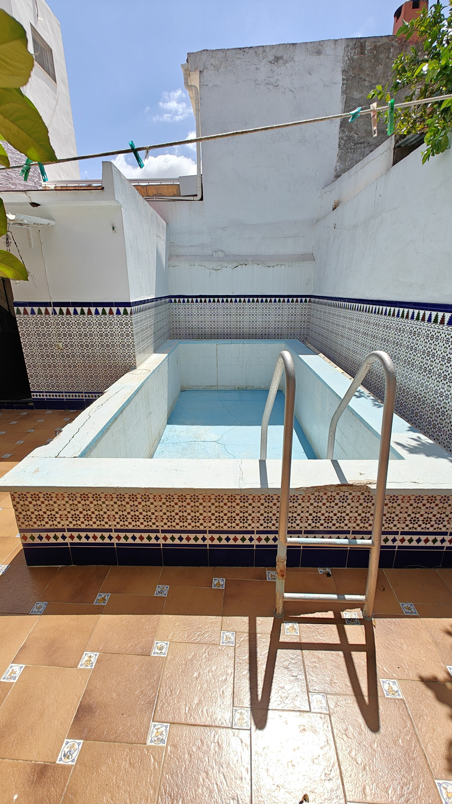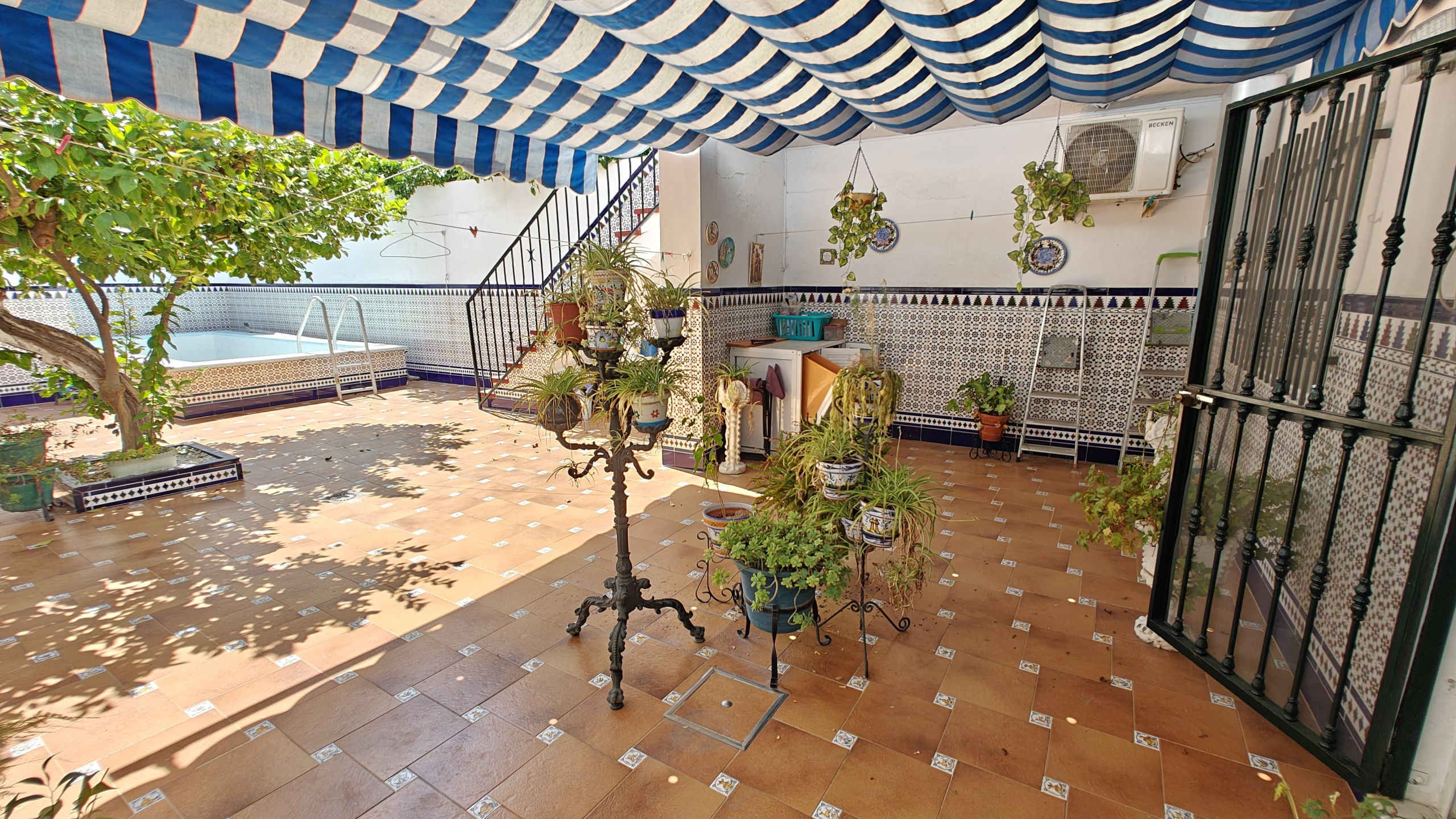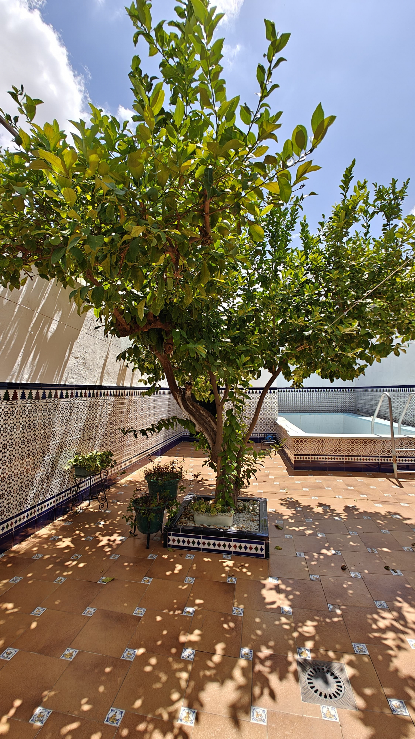 El el patio encontraremos la piscina, un trastero y un gran toldo que nos dará una sombra ideal para pasar los buenos momentos en reunión sin que nadie este expuesto al sol, también tenemos bajo la terraza de primera planta, un espacio destinado a la lavadora que cuenta con un mueble a medida para la lavadora y para la ropa sucia, el termo eléctrico también se encuentra en esa zona. Desde aquí y al igual que desde una de la habitaciones de la segunda planta, podremos acceder a la azote donde tendremos un tragaluz para iluminar el baño de arriba de forma natural.
